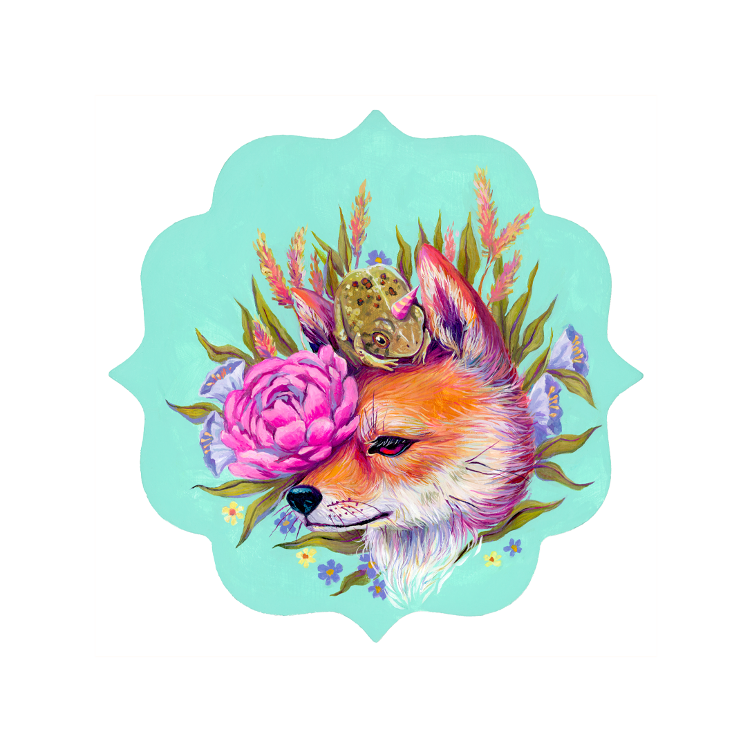 This painting depicts a red Shiba Inu with a toad on her head, wearing a silly hat! This painting was inspired by the time where my Shiba, Misha, found a toad in my backyard for the first time! She would not leave the thing alone, followed it everywhere with her snout close behind it.