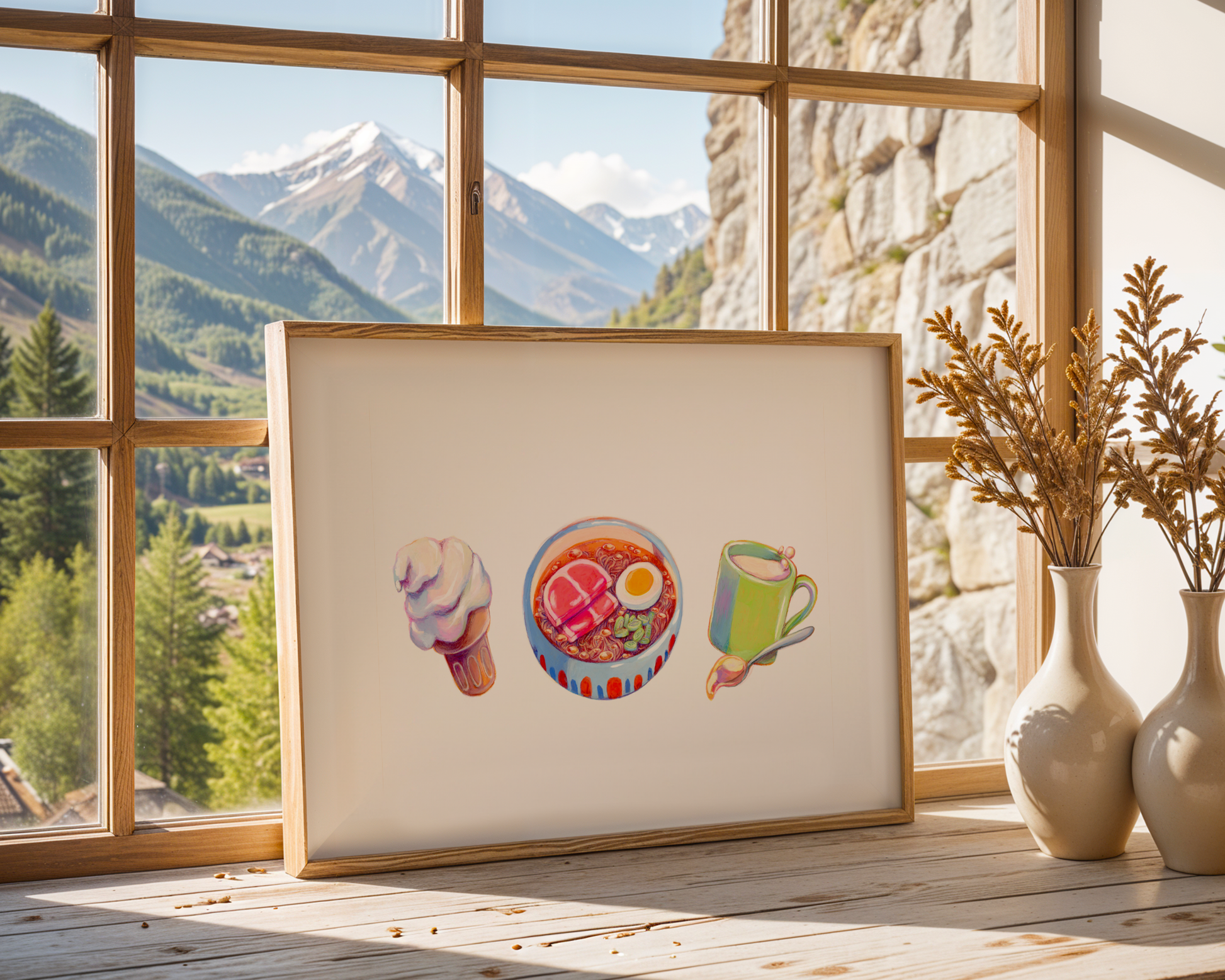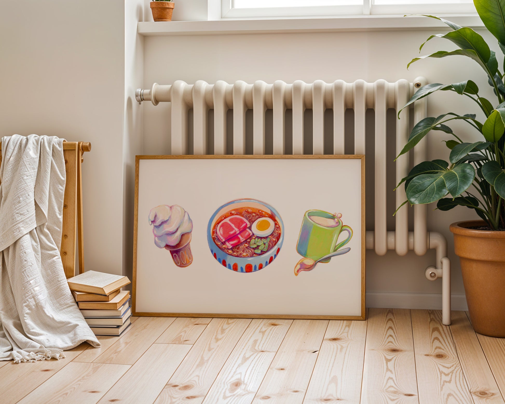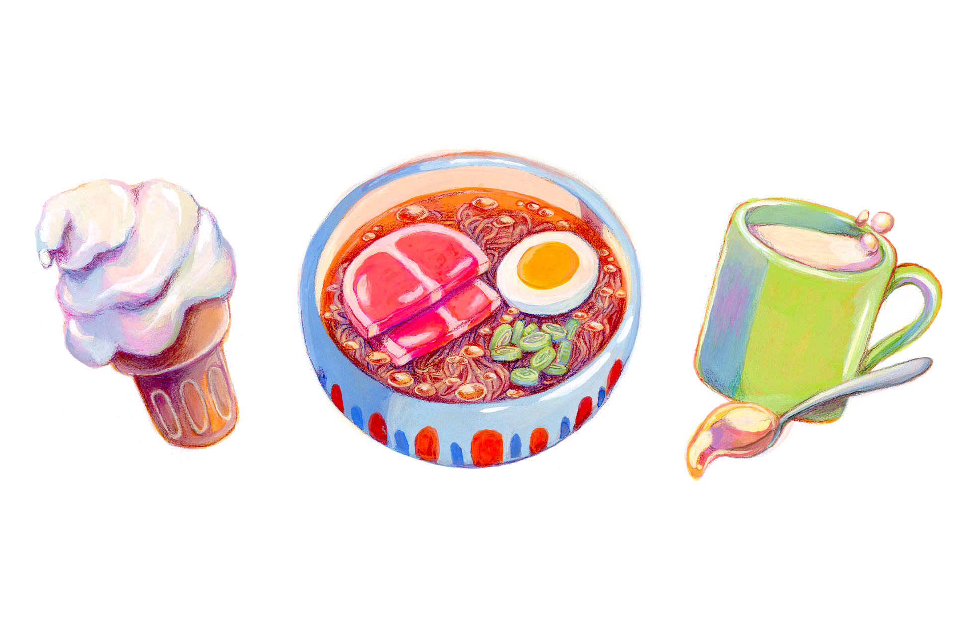 Fan art of the Studio Ghibli movie, Ponyo! This piece depicts three delicious foods from the popular movie, the ice cream, the honey milk, and of course the delicious ramen!