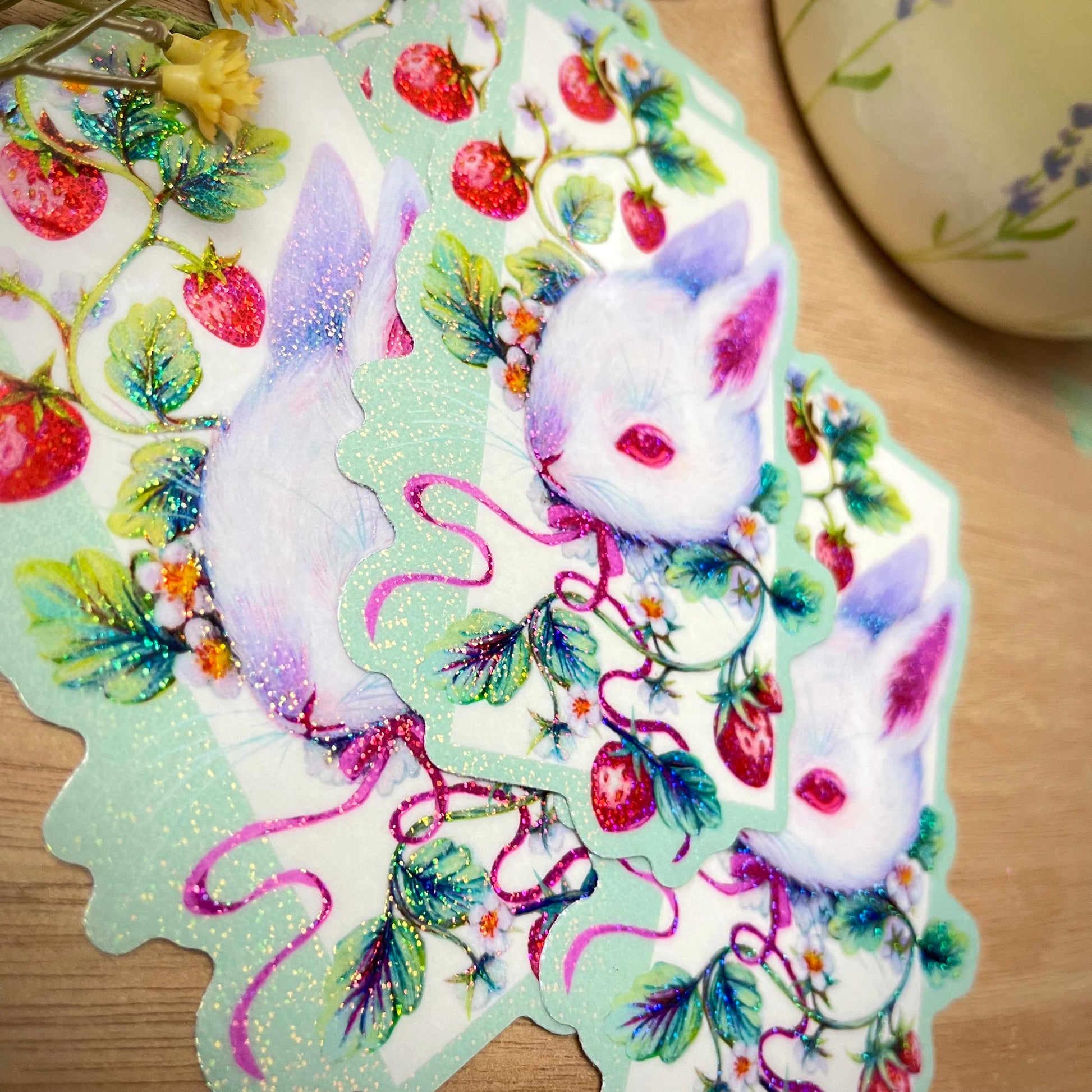 An albino white bunny amongst some deliciously red strawberries on a vine.